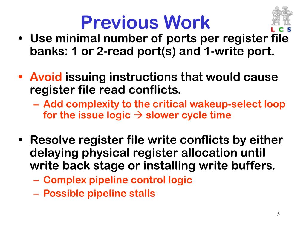 Previous Work • Use minimal number of ports per register file banks: 1 or 2-read port(s) and 1-write port. • Avoid issuing instructions that would cause register file read conflicts. • Add complexity to the critical wakeup-select loop for the issue logic slower cycle time • Resolve register file write conflicts by either delaying physical register allocation until write back stage or installing write buffers. • Complex pipeline control logic • Possible pipeline stalls