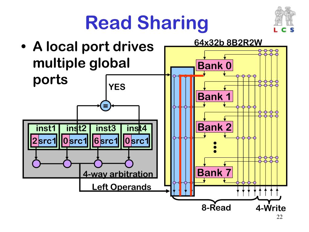 64x32b 8B2R2W Bank 0 YES Bank 1 = inst1 inst2 inst3 inst4 Bank 2 2 src1 0 src1 6 src1 0 src1 Bank 7 4-way arbitration Left Operands 8-Read 4-Write Read Sharing • A local port drives multiple global ports