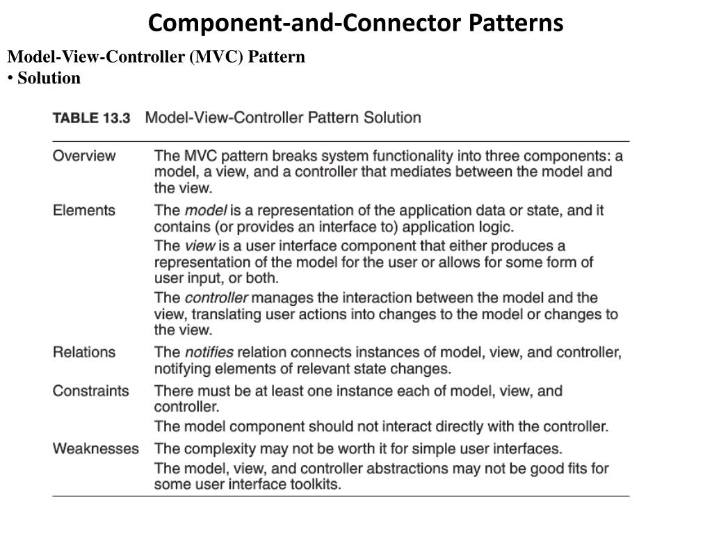 Component-and-ConnectorPatterns • Model-View-Controller (MVC) Pattern • Context: for interactive GUI based systems, to keep modifications to the user interface separate from the rest of the system, and support multiple or alternative views of computing results or current state of data. • Problem: • How can user interface functionality ne kept separate from application functionality and still be responsive to user input, or changes in the underlying application’s data? • How can multiple views of user interface be created, maintained, and coordinated when the underlying application data changes? • Solution