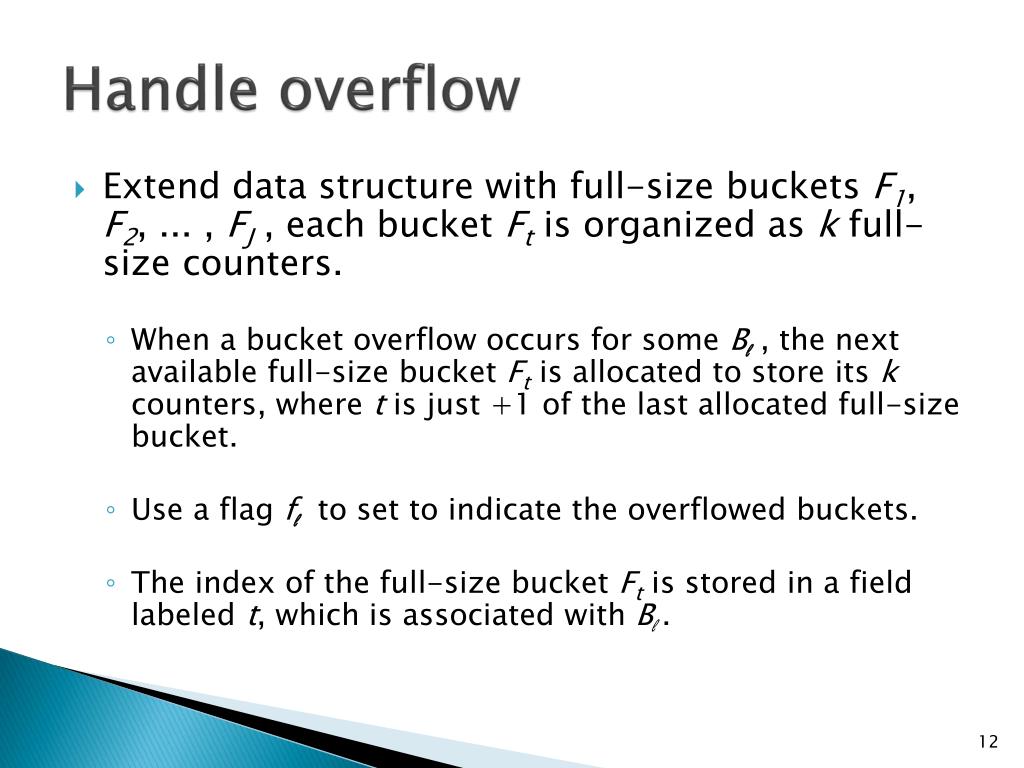 Handle overflow • Extenddatastructure with full-sizebuckets F1, F2, ... , FJ, each bucket Ft is organized ask full-size counters. • When a bucket overflow occurs for some Bl , the next availablefull-size bucket Ft is allocated to store its k counters, wheret is just +1 of the last allocated full-size bucket. • Use a flag fl to set to indicate the overflowed buckets. • The indexof the full-size bucket Ft is stored in a field labeled t, which isassociated with Bl.
