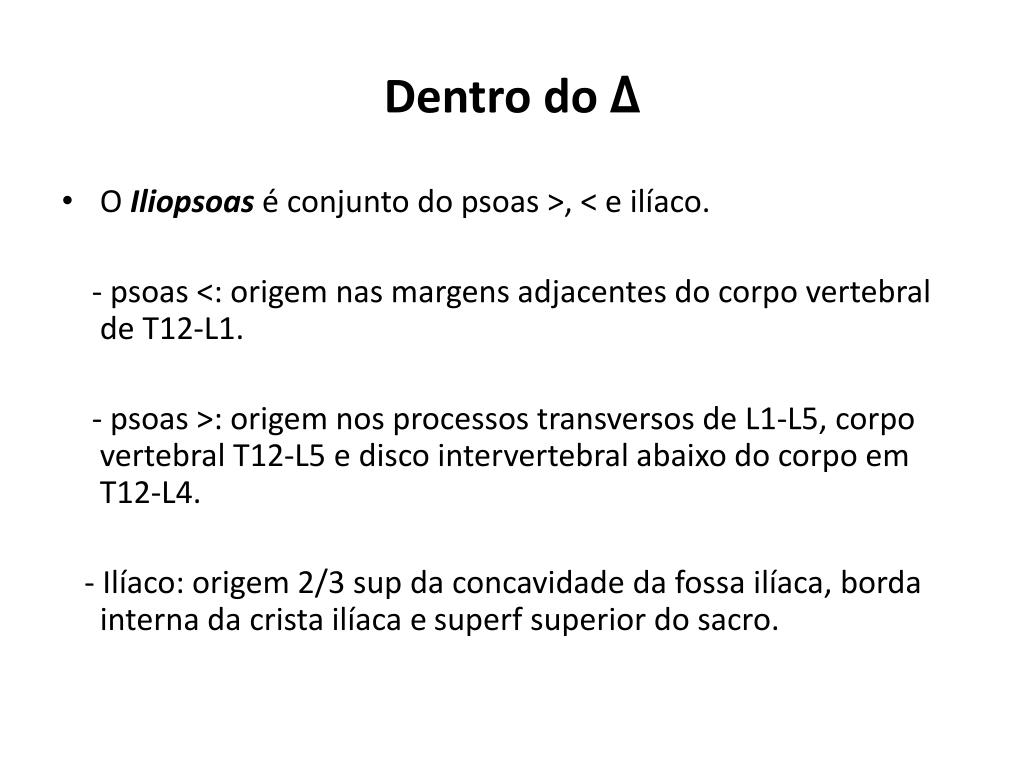 Dentro do Δ • O Iliopsoas é conjunto do psoas >, < e ilíaco. - psoas <: origem nas margens adjacentes do corpo vertebral de T12-L1. - psoas >: origem nos processos transversos de L1-L5, corpo vertebral T12-L5 e disco intervertebral abaixo do corpo em T12-L4. - Ilíaco: origem 2/3 sup da concavidade da fossa ilíaca, borda interna da crista ilíaca e superf superior do sacro.