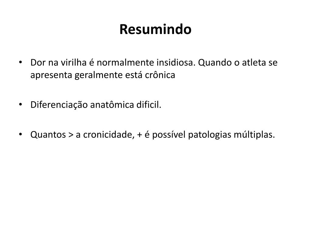 Resumindo • Dor na virilha é normalmente insidiosa. Quando o atleta se apresenta geralmente está crônica • Diferenciação anatômica dificil. • Quantos > a cronicidade, + é possível patologias múltiplas.