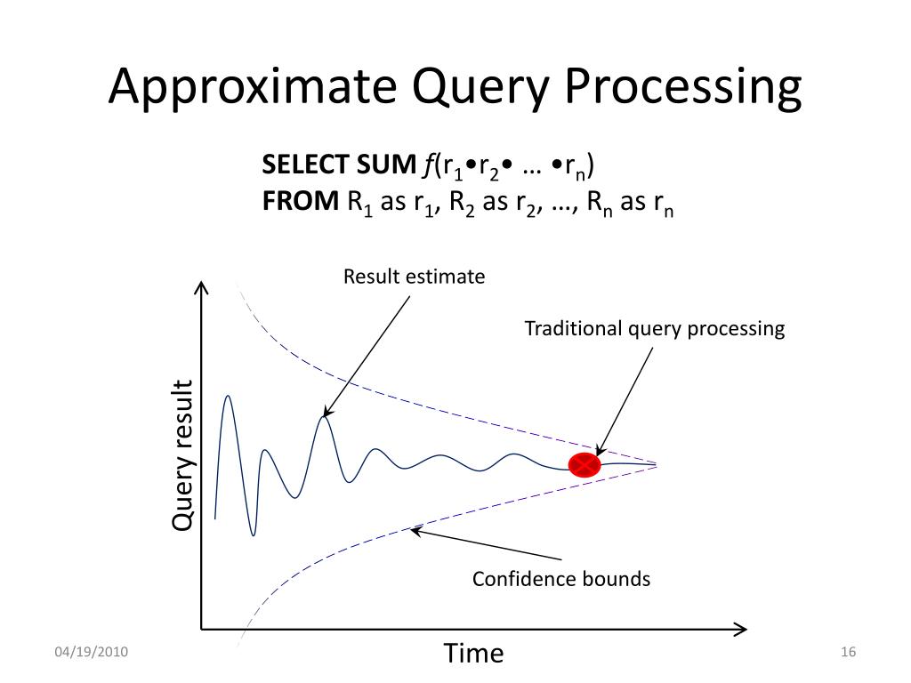 Approximate Query Processing SELECTSUMf(r1•r2• … •rn) FROM R1 as r1, R2 as r2, …, Rn as rn Result estimate Traditional query processing Query result Confidence bounds Time