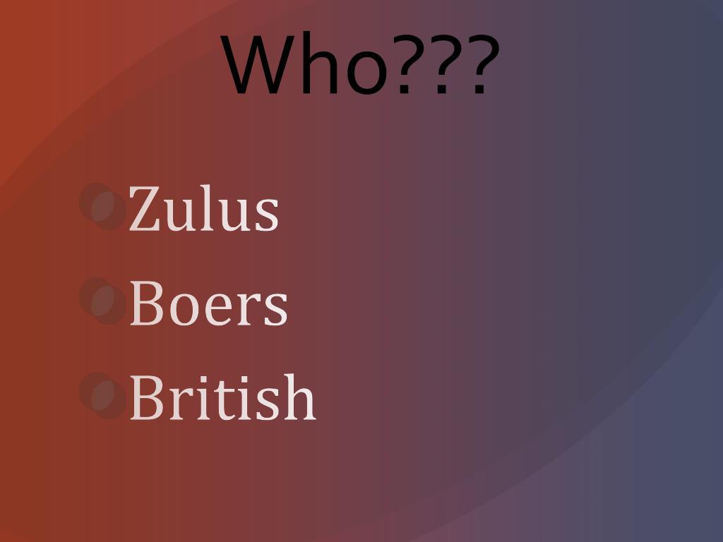 South Africa. “I hear the sound of the feet of a great white people. They will tread this land flat.” -Shaka. Who??? . Zulus Boers British. Zulus. Powerful African tribe One of the greatest African Empires Fierce Warriors Still 2 million in South Africa today. Zulus.