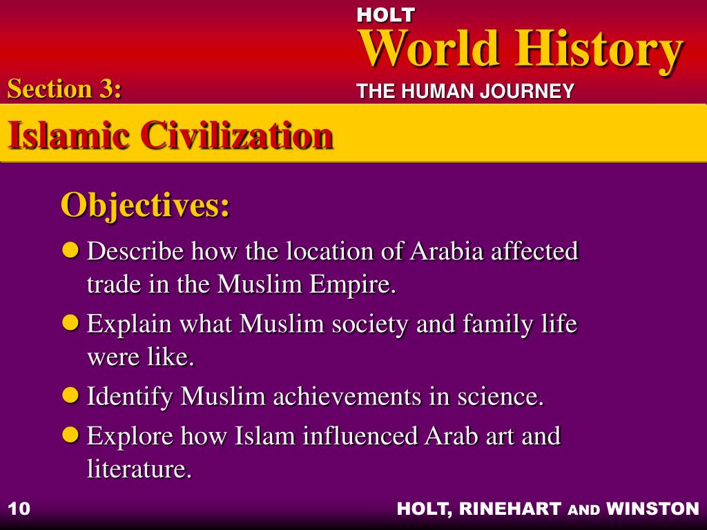 Section 3: Islamic Civilization Objectives: • Describe how the location of Arabia affected trade in the Muslim Empire. • Explain what Muslim society and family life were like. • Identify Muslim achievements in science. • Explore how Islam influenced Arab art and literature.