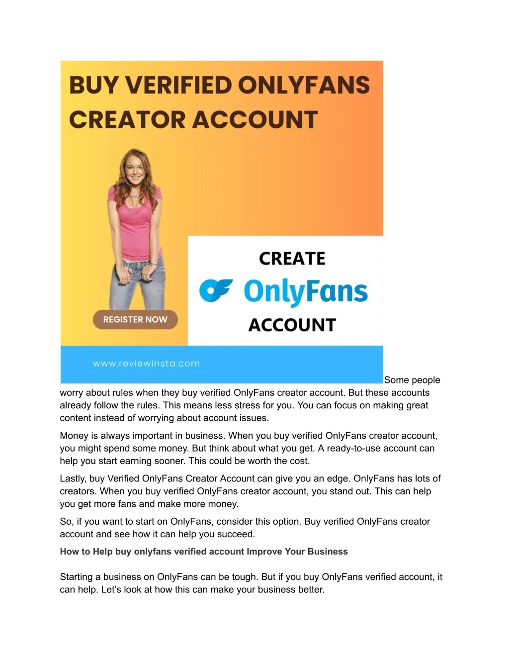 Exchange guarantee 24/7 customer support Money back guarantee 24-hour response/contact Email: reviewinsta38@gmail.com Telegram: @Reviewinsta38 Skype: Reviewinsta WhatsApp: +1 (717) 896-0147 https://reviewinsta.com/shop/buy-verified-onlyfans-creator-account/ Buy Verified OnlyFans Creator Account Starting an online business can be tough. But using OnlyFans can make it easier. To do this, you need to buy verified OnlyFans creator account. This step is really important for your success. When you buy verified OnlyFans creator account, you save time. You don’t have to wait for approval or deal with long sign-up processes. As a result, you can begin earning money more quickly. Time is business money, so this is a big plus. Safety is another reason to buy verified OnlyFans creator account. OnlyFans has already checked these accounts. This means less risk for you and your customers. People trust verified accounts more, which can help you grow your business. If you buy verified OnlyFans creator account, you get a head start. The account might already have some followers. This gives you a base to build on. It’s easier to grow when you’re not starting from zero. Some people worry about the cost to buy verified OnlyFans creator account. But think of it as an investment. It can help you earn more in the long run. The benefits often outweigh the initial cost.
