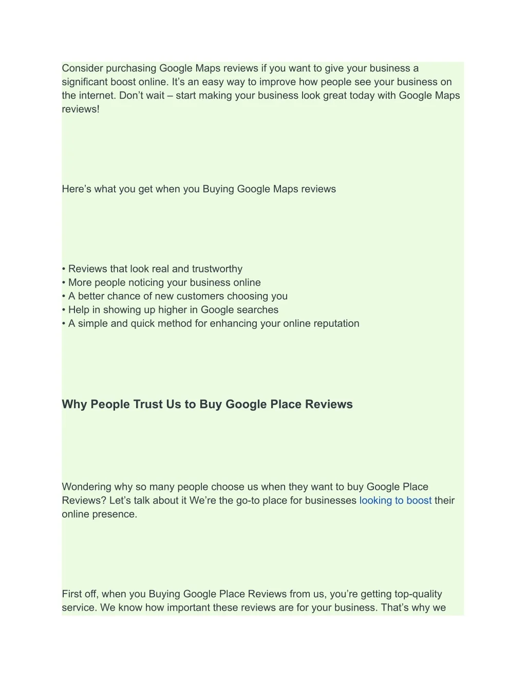 Consider purchasing Google Maps reviews if you want to give your business a significant boost online. It’s an easy way to improve how people see your business on the internet. Don’t wait – start making your business look great today with Google Maps reviews! Here’s what you get when you Buying Google Maps reviews • Reviews that look real and trustworthy • More people noticing your business online • A better chance of new customers choosing you • Help in showing up higher in Google searches • A simple and quick method for enhancing your online reputation Why People Trust Us to Buy Google Place Reviews Wondering why so many people choose us when they want to buy Google Place Reviews? Let’s talk about it We’re the go-to place for businesses looking to boost their online presence. First off, when you Buying Google Place Reviews from us, you’re getting top-quality service. We know how important these reviews are for your business. That’s why we