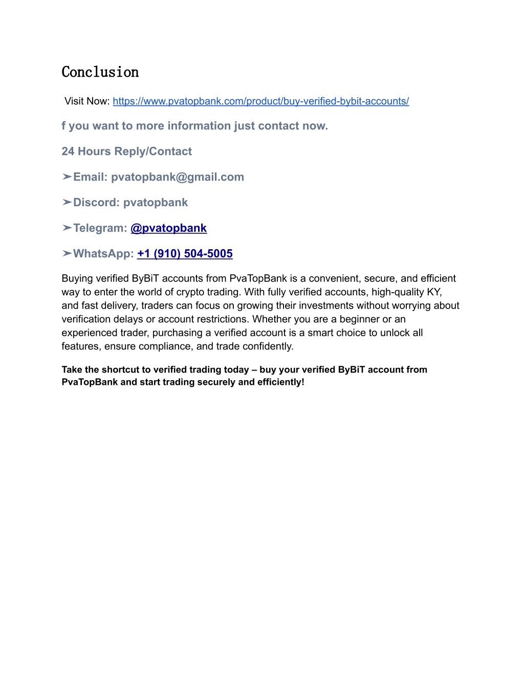 Conclusion Visit Now: https://www.pvatopbank.com/product/buy-verified-bybit-accounts/ f you want to more information just contact now. 24 Hours Reply/Contact ➤Email: pvatopbank@gmail.com ➤Discord: pvatopbank ➤Telegram: @pvatopbank ➤WhatsApp: +1 (910) 504-5005 Buying verified ByBiT accounts from PvaTopBank is a convenient, secure, and efficient way to enter the world of crypto trading. With fully verified accounts, high-quality KY, and fast delivery, traders can focus on growing their investments without worrying about verification delays or account restrictions. Whether you are a beginner or an experienced trader, purchasing a verified account is a smart choice to unlock all features, ensure compliance, and trade confidently. Take the shortcut to verified trading today – buy your verified ByBiT account from PvaTopBank and start trading securely and efficiently!