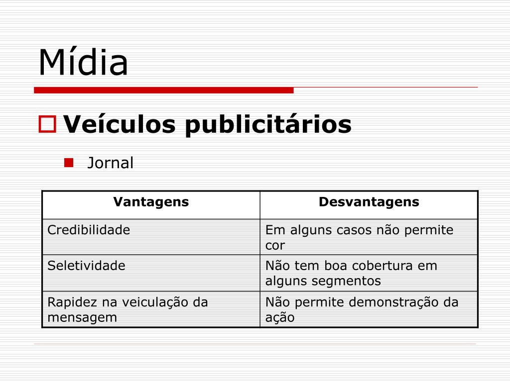 Mídia • Veículos publicitários • Jornal • Mídia seletiva • Natureza: informar, analisar e comentar os acontecimentos • Circulação local superior a revistas • Custo = centímetros x colunas • P&B/Cor