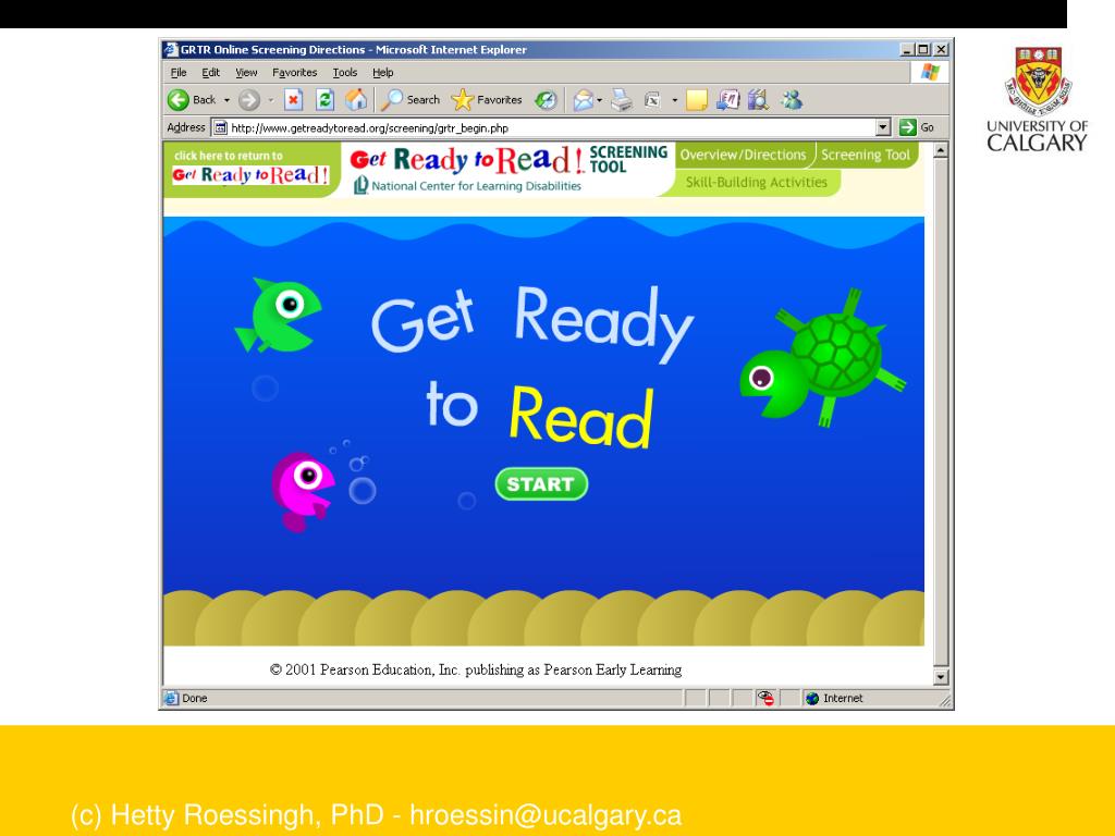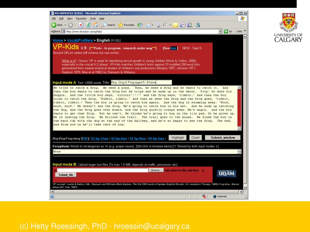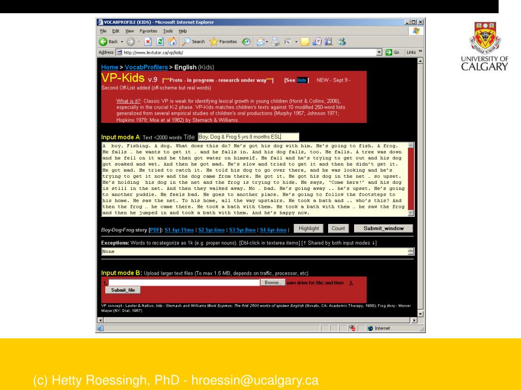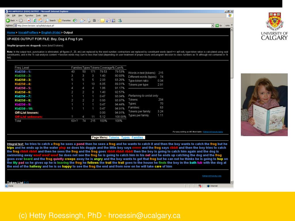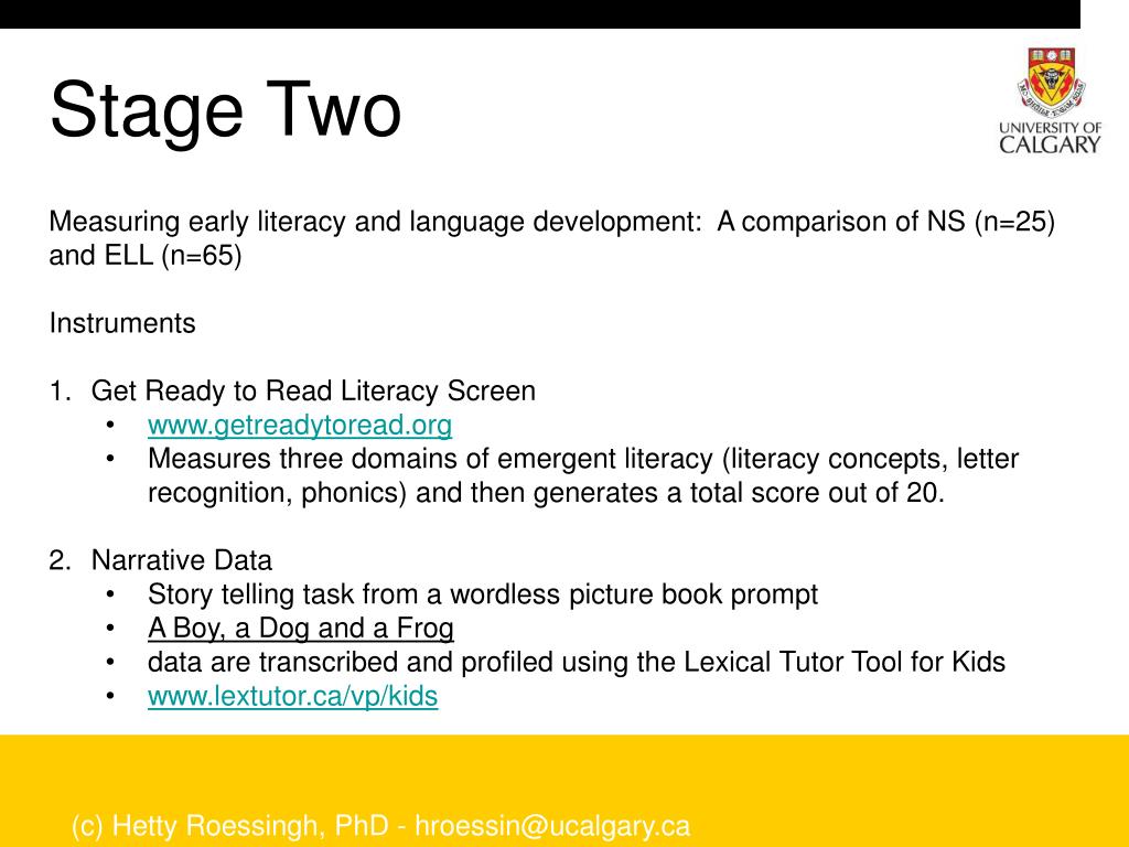 Stage Two • Measuring early literacy and language development: A comparison of NS (n=25) and ELL (n=65) • Instruments • Get Ready to Read Literacy Screen • www.getreadytoread.org • Measures three domains of emergent literacy (literacy concepts, letter recognition, phonics) and then generates a total score out of 20. • Narrative Data • Story telling task from a wordless picture book prompt • A Boy, a Dog and a Frog • data are transcribed and profiled using the Lexical Tutor Tool for Kids • www.lextutor.ca/vp/kids (c) Hetty Roessingh, PhD - hroessin@ucalgary.ca