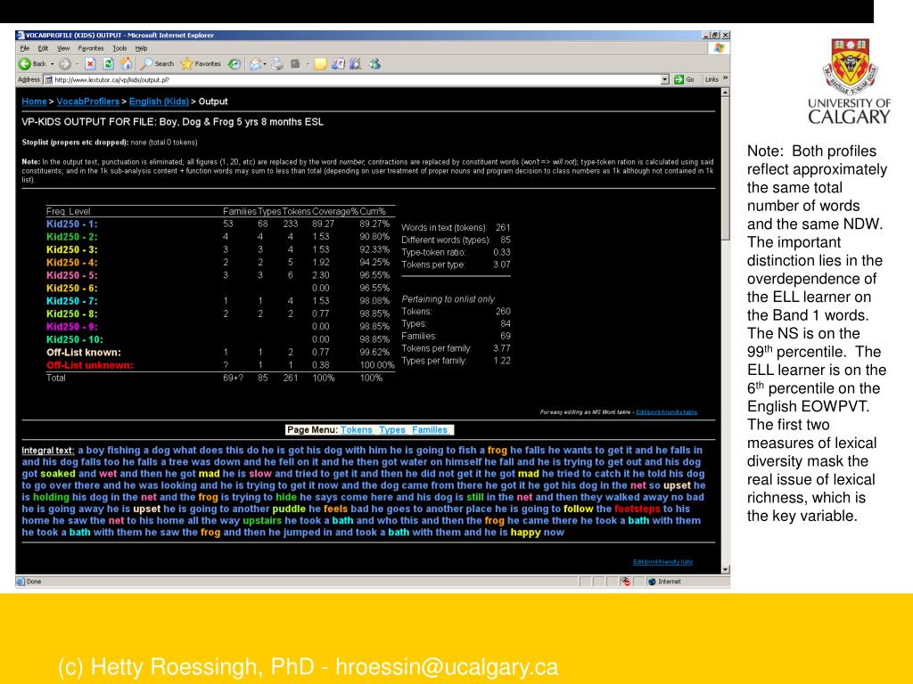 Note: Both profiles reflect approximately the same total number of words and the same NDW. The important distinction lies in the overdependence of the ELL learner on the Band 1 words. The NS is on the 99th percentile. The ELL learner is on the 6th percentile on the English EOWPVT. The first two measures of lexical diversity mask the real issue of lexical richness, which is the key variable. (c) Hetty Roessingh, PhD - hroessin@ucalgary.ca