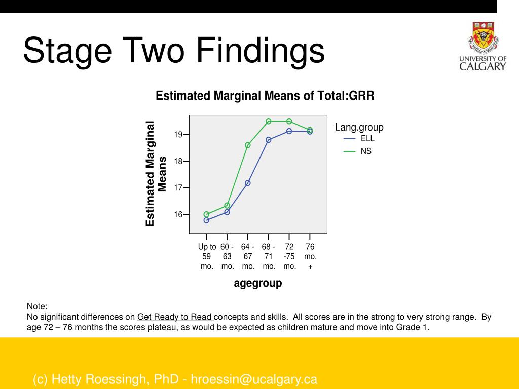 Stage Two Findings Note: No significant differences on Get Ready to Read concepts and skills. All scores are in the strong to very strong range. By age 72 – 76 months the scores plateau, as would be expected as children mature and move into Grade 1. (c) Hetty Roessingh, PhD - hroessin@ucalgary.ca