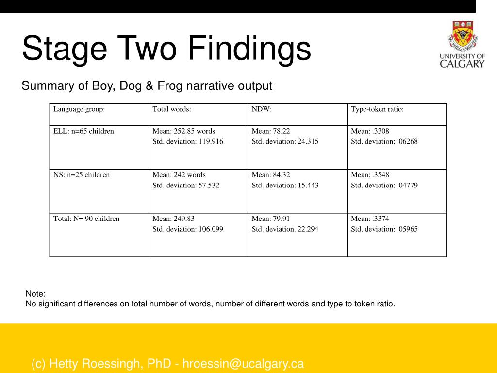 Stage Two Findings Summary of Boy, Dog & Frog narrative output Note: No significant differences on total number of words, number of different words and type to token ratio. (c) Hetty Roessingh, PhD - hroessin@ucalgary.ca