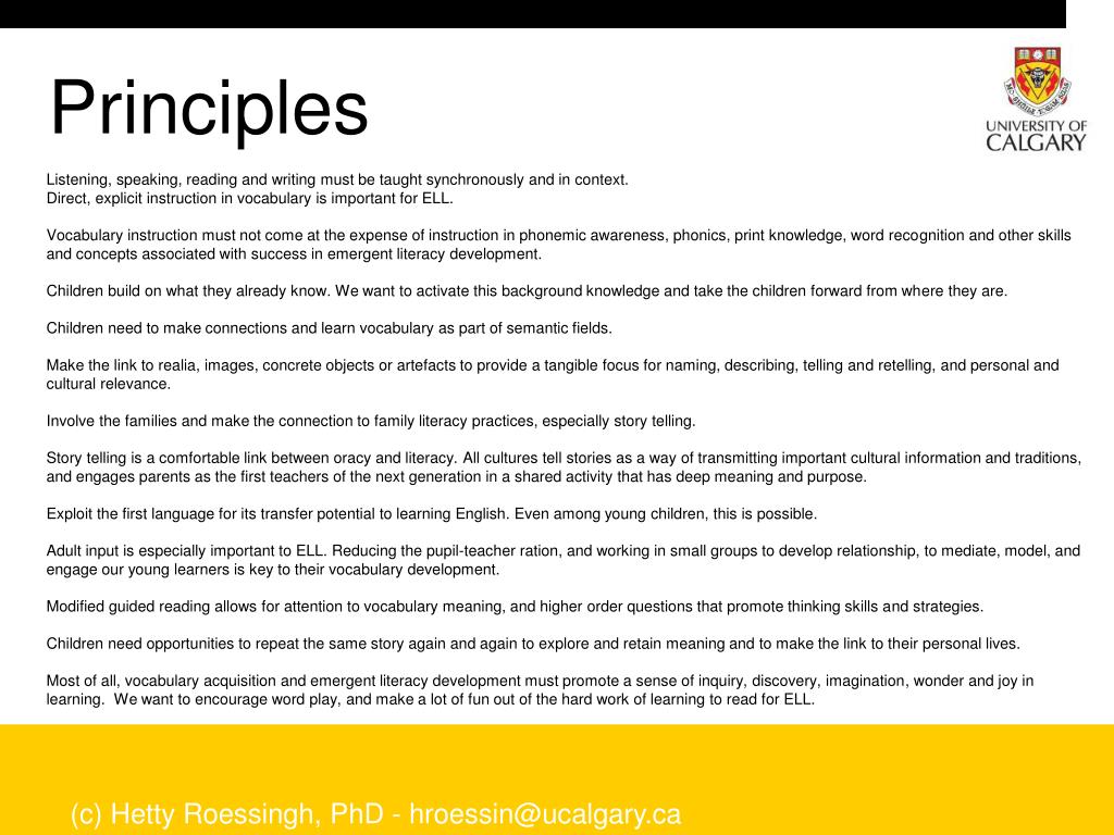Principles Listening, speaking, reading and writing must be taught synchronously and in context. Direct, explicit instruction in vocabulary is important for ELL. Vocabulary instruction must not come at the expense of instruction in phonemic awareness, phonics, print knowledge, word recognition and other skills and concepts associated with success in emergent literacy development. Children build on what they already know. We want to activate this background knowledge and take the children forward from where they are. Children need to make connections and learn vocabulary as part of semantic fields. Make the link to realia, images, concrete objects or artefacts to provide a tangible focus for naming, describing, telling and retelling, and personal and cultural relevance. Involve the families and make the connection to family literacy practices, especially story telling. Story telling is a comfortable link between oracy and literacy. All cultures tell stories as a way of transmitting important cultural information and traditions, and engages parents as the first teachers of the next generation in a shared activity that has deep meaning and purpose. Exploit the first language for its transfer potential to learning English. Even among young children, this is possible. Adult input is especially important to ELL. Reducing the pupil-teacher ration, and working in small groups to develop relationship, to mediate, model, and engage our young learners is key to their vocabulary development. Modified guided reading allows for attention to vocabulary meaning, and higher order questions that promote thinking skills and strategies. Children need opportunities to repeat the same story again and again to explore and retain meaning and to make the link to their personal lives. Most of all, vocabulary acquisition and emergent literacy development must promote a sense of inquiry, discovery, imagination, wonder and joy in learning. We want to encourage word play, and make a lot of fun out of the hard work of learning to read for ELL. (c) Hetty Roessingh, PhD - hroessin@ucalgary.ca