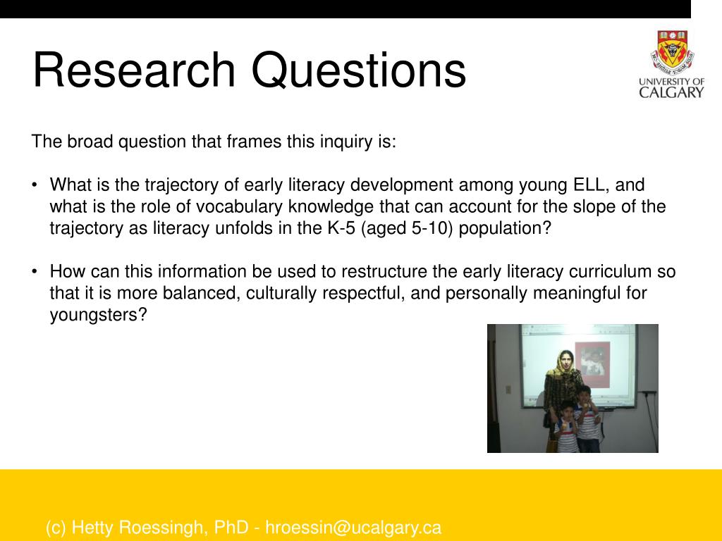 Research Questions • The broad question that frames this inquiry is: • What is the trajectory of early literacy development among young ELL, and what is the role of vocabulary knowledge that can account for the slope of the trajectory as literacy unfolds in the K-5 (aged 5-10) population? • How can this information be used to restructure the early literacy curriculum so that it is more balanced, culturally respectful, and personally meaningful for youngsters? (c) Hetty Roessingh, PhD - hroessin@ucalgary.ca
