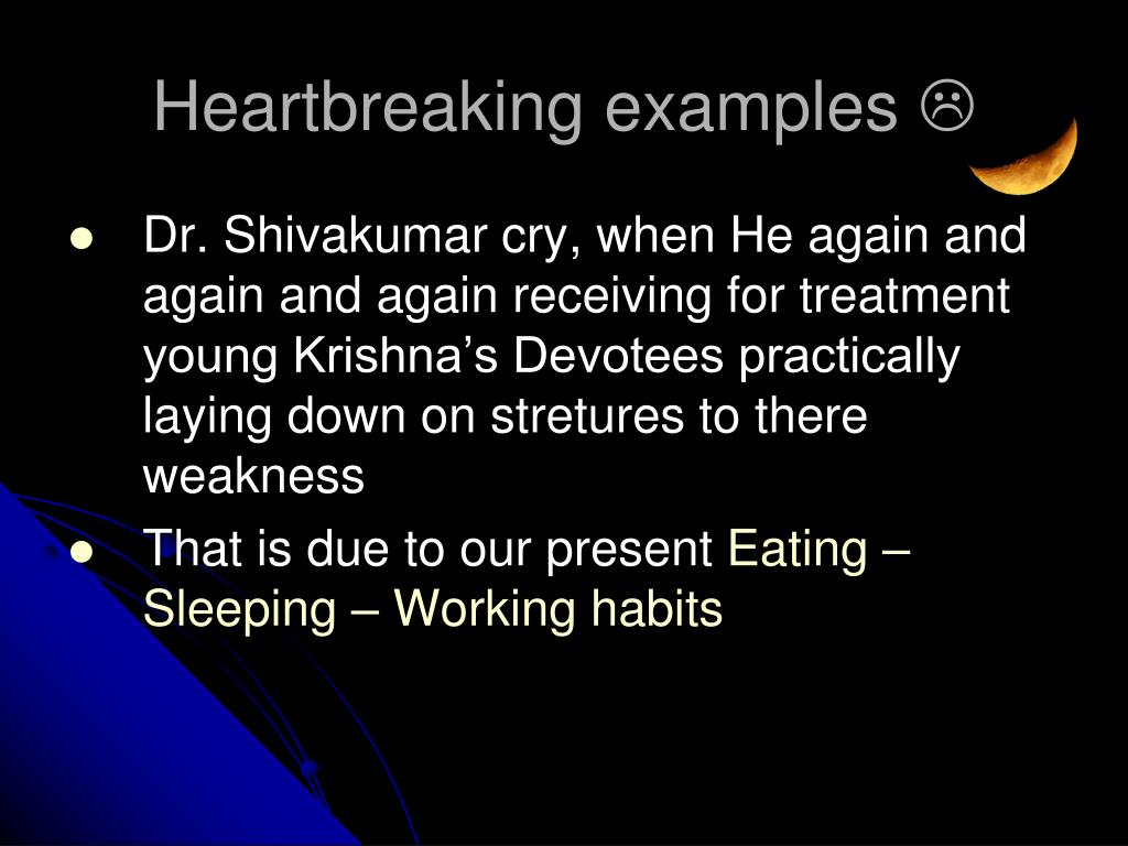 Dr. Shivakumar cry, when He again and again and again receiving for treatment young Krishna’s Devotees practically laying down on stretures to there weakness That is due to our present Eating – Sleeping – Working habits Heartbreaking examples