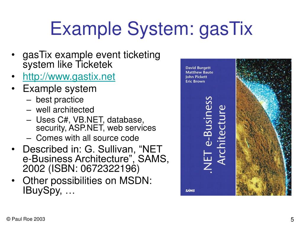 Example System: gasTix • gasTix example event ticketing system like Ticketek • http://www.gastix.net • Example system • best practice • well architected • Uses C#, VB.NET, database, security, ASP.NET, web services • Comes with all source code • Described in: G. Sullivan, “NET e-Business Architecture”, SAMS, 2002 (ISBN: 0672322196) • Other possibilities on MSDN: IBuySpy, … © Paul Roe 2003