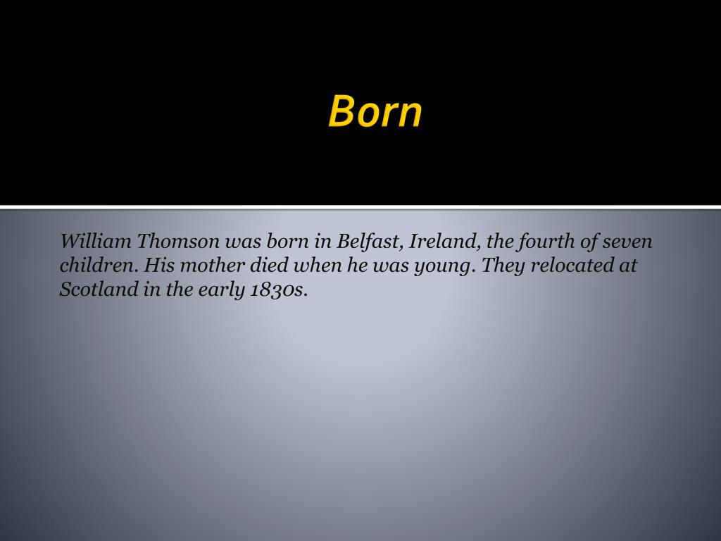 Born William Thomson was born in Belfast, Ireland, the fourth of seven children. His mother died when he was young. They relocated at Scotland in the early 1830s.