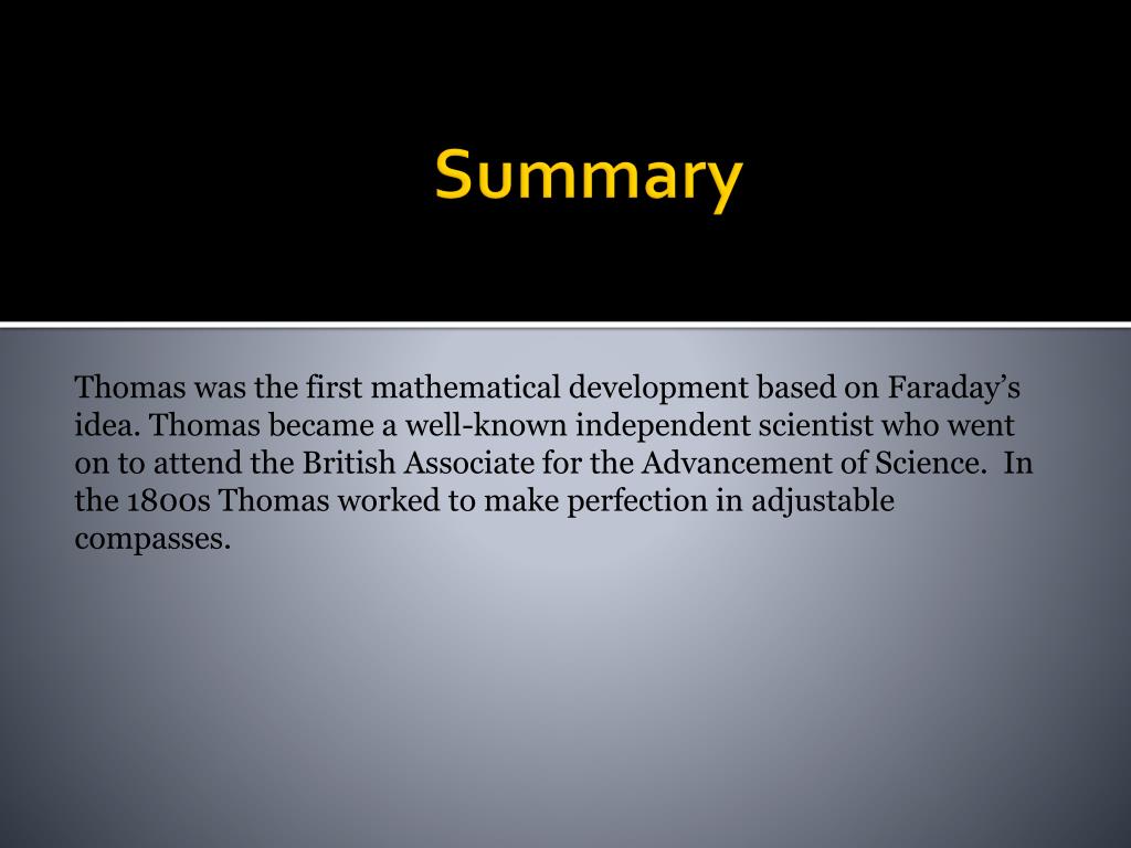 Summary Thomas was the first mathematical development based on Faraday’s idea. Thomas became a well-known independent scientist who went on to attend the British Associate for the Advancement of Science. In the 1800s Thomas worked to make perfection in adjustable compasses.
