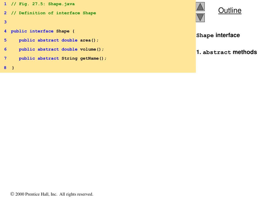 1 // Fig. 27.5: Shape.java 2 // Definition of interface Shape 3 4 publicinterface Shape { 8 } 5 publicabstractdouble area(); 6 publicabstractdouble volume(); 7 publicabstract String getName(); 8 } Shape interface 1. abstract methods