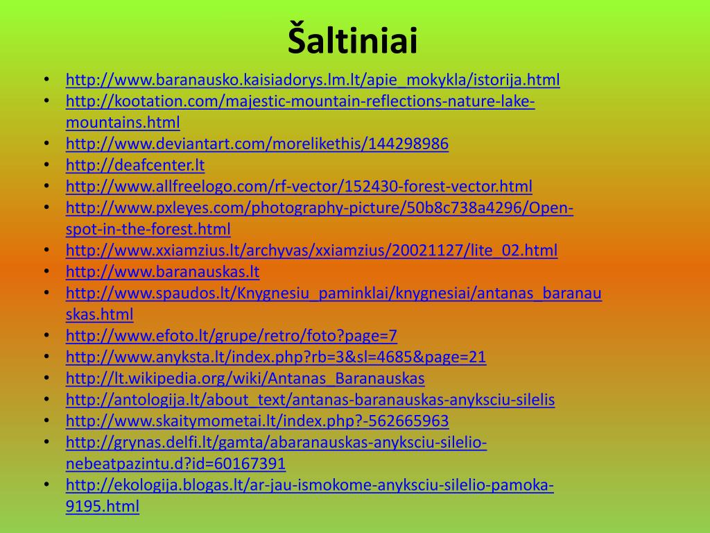 Šaltiniai • http://www.baranausko.kaisiadorys.lm.lt/apie_mokykla/istorija.html • http://kootation.com/majestic-mountain-reflections-nature-lake-mountains.html • http://www.deviantart.com/morelikethis/144298986 • http://deafcenter.lt • http://www.allfreelogo.com/rf-vector/152430-forest-vector.html • http://www.pxleyes.com/photography-picture/50b8c738a4296/Open-spot-in-the-forest.html • http://www.xxiamzius.lt/archyvas/xxiamzius/20021127/lite_02.html • http://www.baranauskas.lt • http://www.spaudos.lt/Knygnesiu_paminklai/knygnesiai/antanas_baranauskas.html • http://www.efoto.lt/grupe/retro/foto?page=7 • http://www.anyksta.lt/index.php?rb=3&sl=4685&page=21 • http://lt.wikipedia.org/wiki/Antanas_Baranauskas • http://antologija.lt/about_text/antanas-baranauskas-anyksciu-silelis • http://www.skaitymometai.lt/index.php?-562665963 • http://grynas.delfi.lt/gamta/abaranauskas-anyksciu-silelio-nebeatpazintu.d?id=60167391 • http://ekologija.blogas.lt/ar-jau-ismokome-anyksciu-silelio-pamoka-9195.html