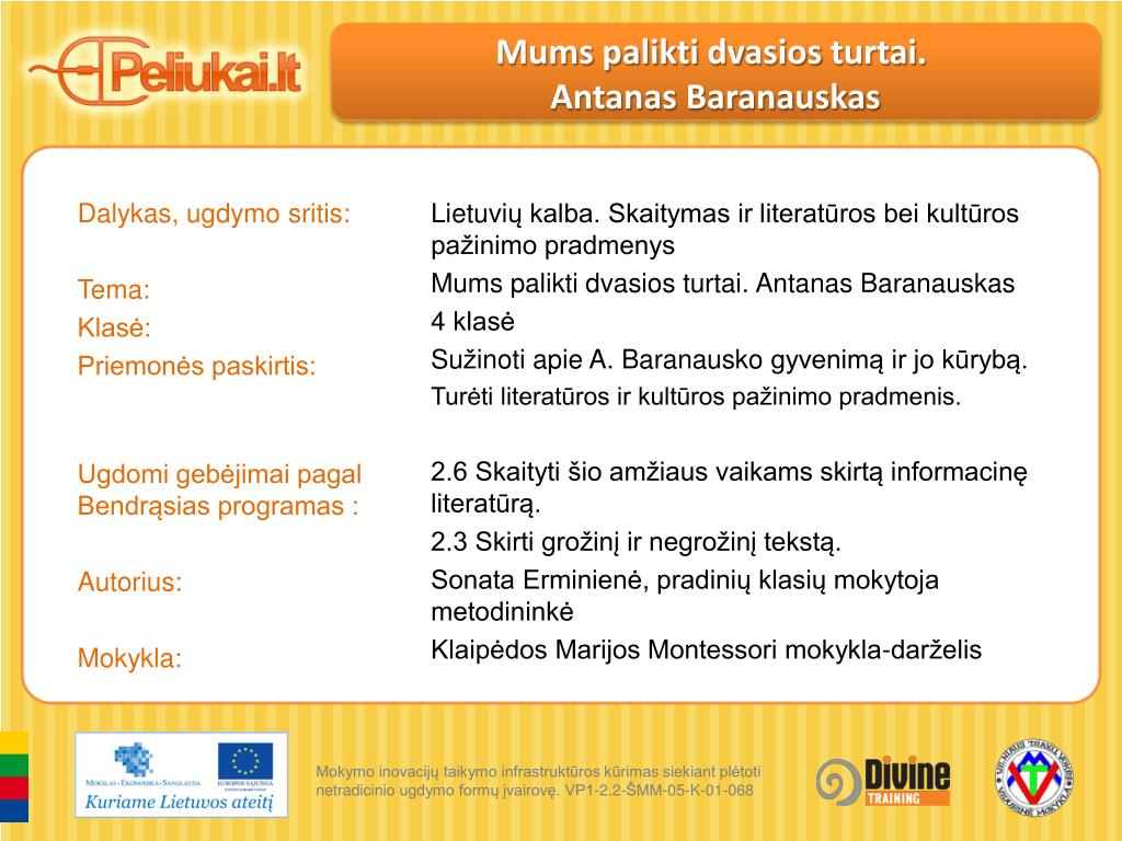 Mums palikti d v asios turtai . Antanas Baranauskas. Dalykas, ugdymo sritis: Tema: Klasė: Priemonės paskirtis: Ugdomi gebėjimai pagal Bendrąsias programas : Autorius: Mokykla:. Lietuvi ų kalba. Skaitymas ir literatūros bei kultūros pažinimo pradmenys