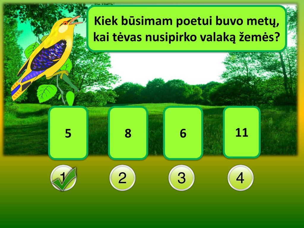 Kiek būsimam poetui buvo metų, kai tėvas nusipirko valaką žemės? 5 8 6 11