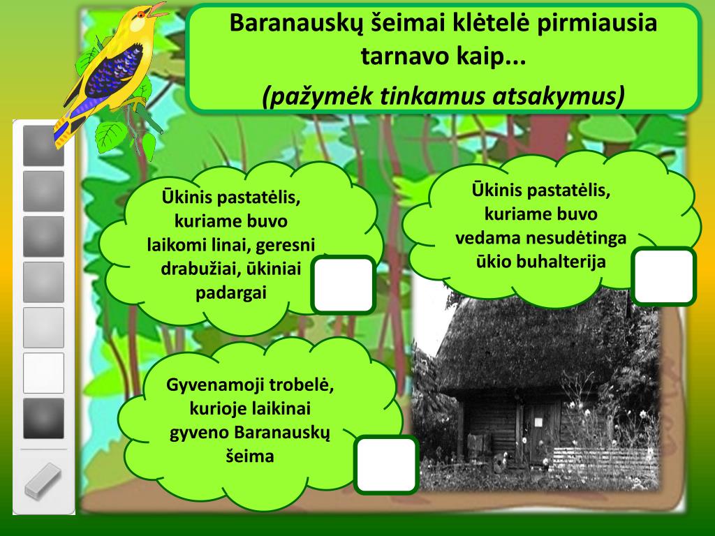 Baranauskų šeimai klėtelė pirmiausia tarnavo kaip... (pažymėk tinkamus atsakymus) Ūkinis pastatėlis, kuriame buvo vedama nesudėtinga ūkio buhalterija Ūkinis pastatėlis, kuriame buvo laikomi linai, geresni drabužiai, ūkiniai padargai Gyvenamoji trobelė, kurioje laikinai gyveno Baranauskų šeima
