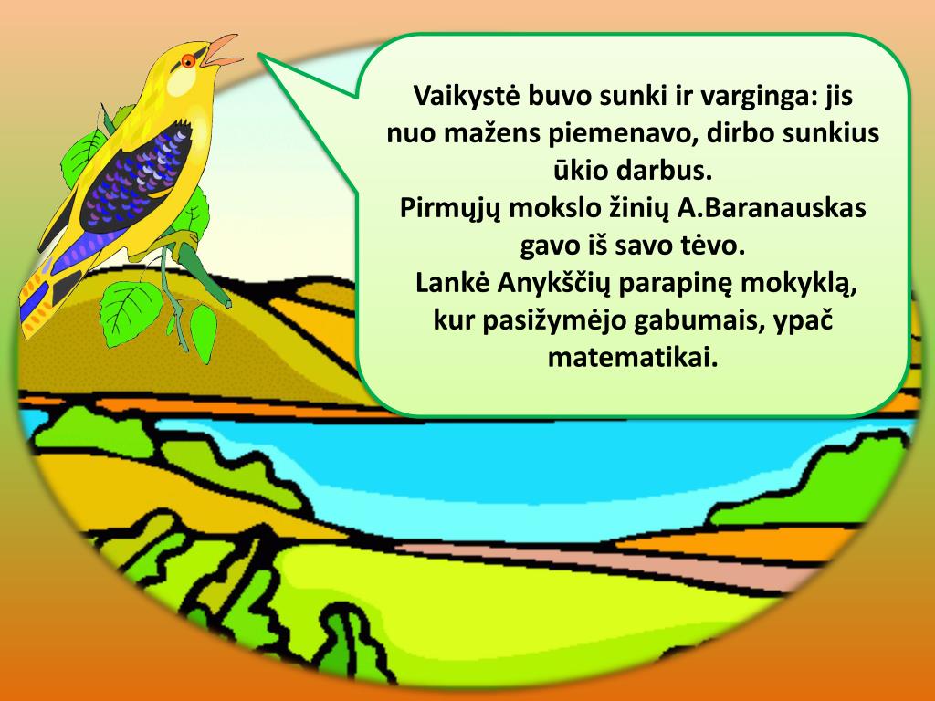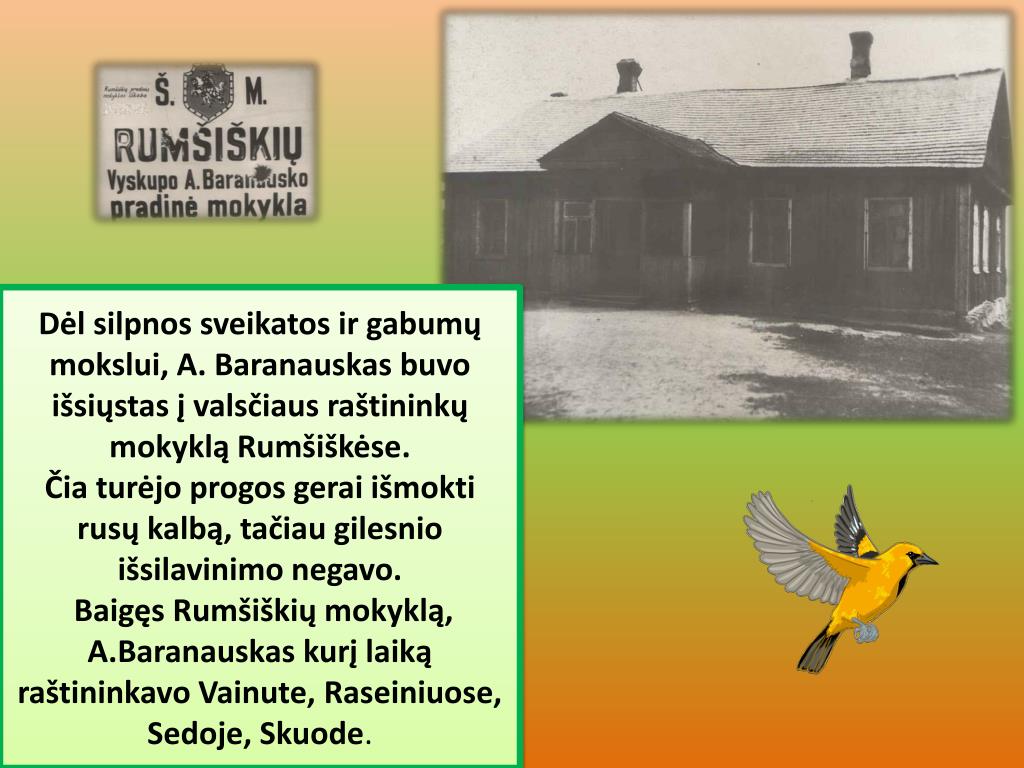 Dėl silpnos sveikatos ir gabumų mokslui, A.Baranauskas buvo išsiųstas į valsčiaus raštininkų mokyklą Rumšiškėse. • TAIP • NE