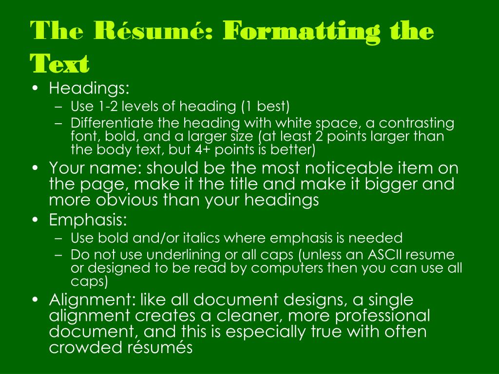 The Résumé: Formatting the Text • Headings: • Use 1-2 levels of heading (1 best) • Differentiate the heading with white space, a contrasting font, bold, and a larger size (at least 2 points larger than the body text, but 4+ points is better) • Your name: should be the most noticeable item on the page, make it the title and make it bigger and more obvious than your headings • Emphasis: • Use bold and/or italics where emphasis is needed • Do not use underlining or all caps (unless an ASCII resume or designed to be read by computers then you can use all caps) • Alignment: like all document designs, a single alignment creates a cleaner, more professional document, and this is especially true with often crowded résumés
