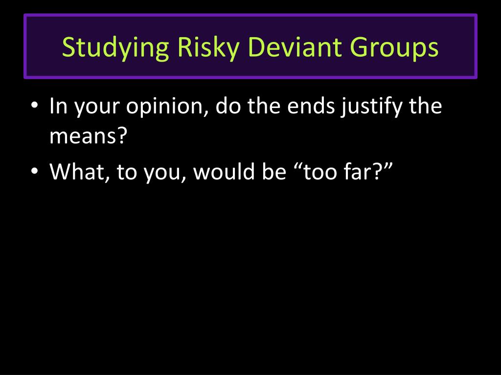 Studying Risky Deviant Groups • In your opinion, do the ends justify the means? • What, to you, would be “too far?”