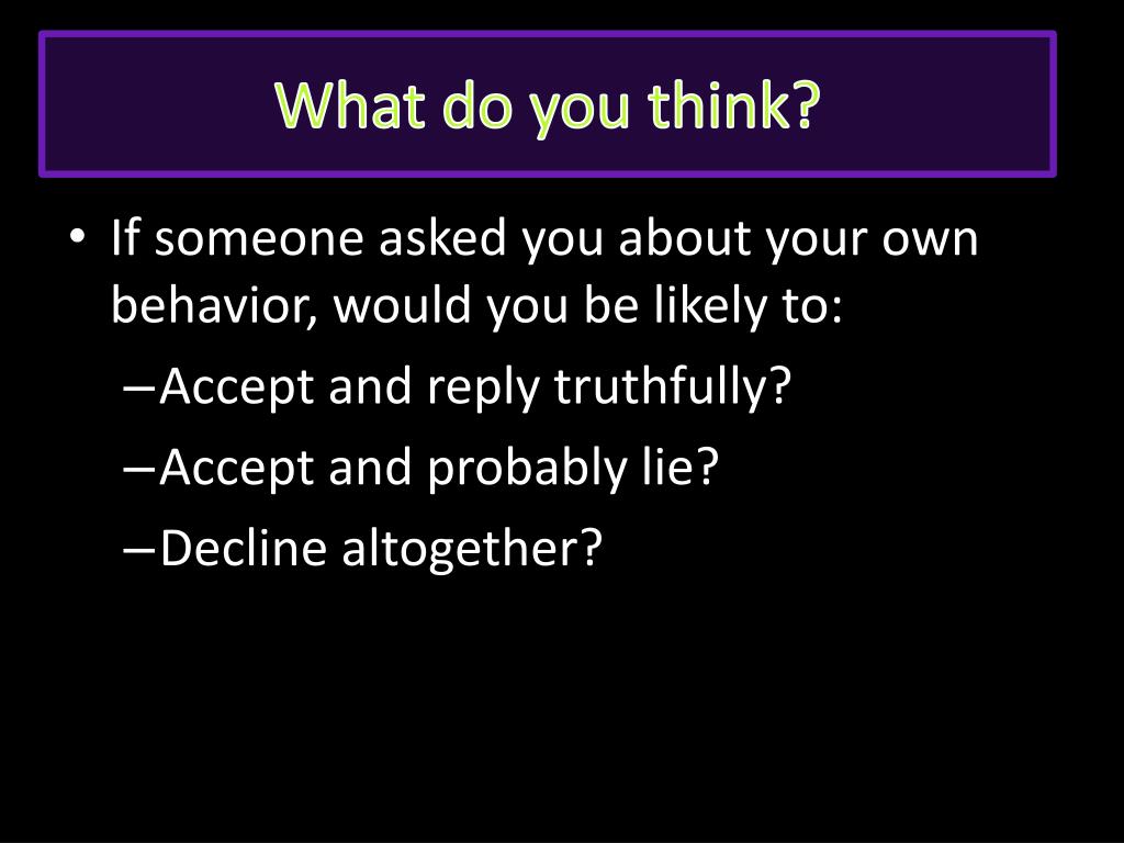 What do you think? • If someone asked you about your own behavior, would you be likely to: • Accept and reply truthfully? • Accept and probably lie? • Decline altogether?