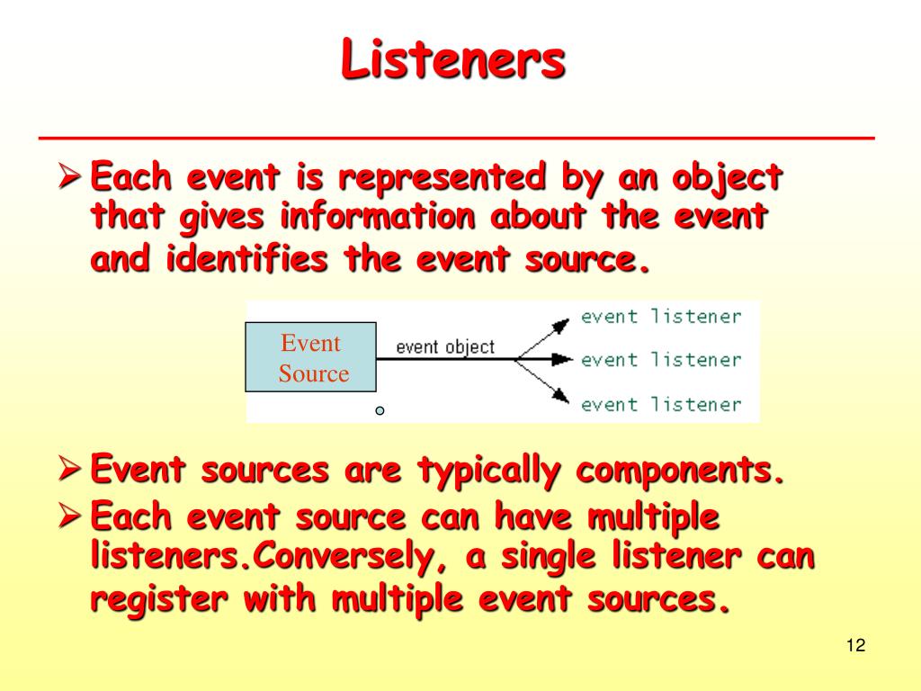 Listeners Event Source • Each event is represented by an object that gives information about the event and identifies the event source. • Event sources are typically components. • Each event source can have multiple listeners.Conversely, a single listener can register with multiple event sources.