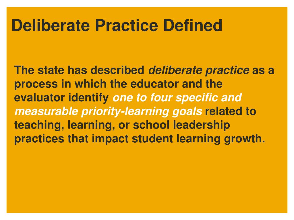 Deliberate Practice Defined The state has described deliberate practice as a process in which the educator and the evaluator identify one to four specific and measurable priority-learning goals related to teaching, learning, or school leadership practices that impact student learning growth.
