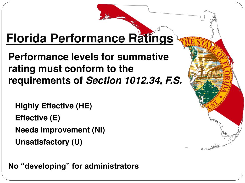Florida Performance Ratings Performance levels for summative rating must conform to the requirements of Section 1012.34, F.S. Highly Effective (HE) Effective (E) Needs Improvement (NI) Unsatisfactory (U) No “developing” for administrators