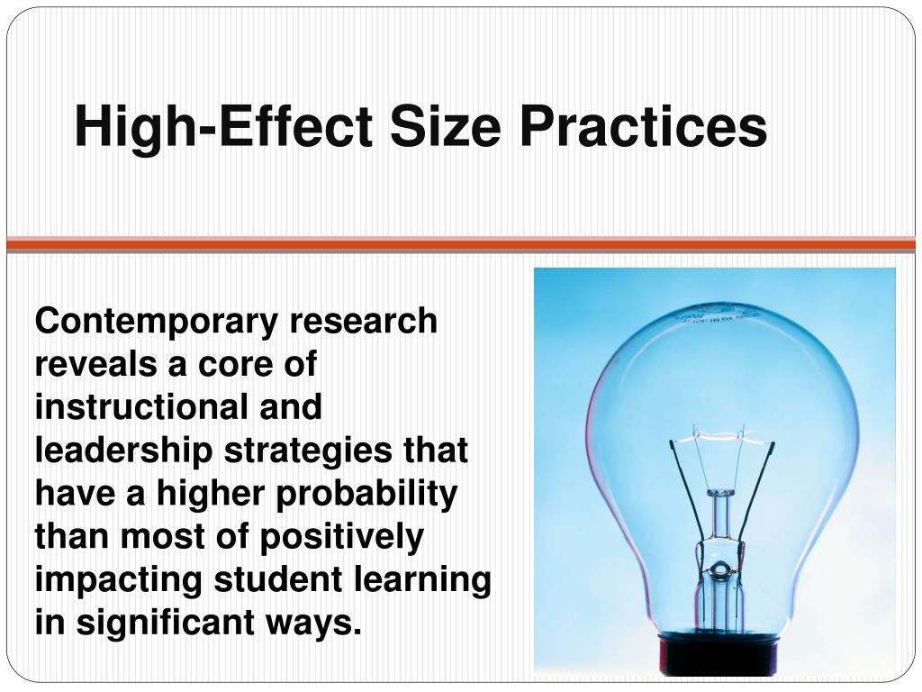 High-Effect Size Practices Contemporary research reveals a core of instructional and leadership strategies that have a higher probability than most of positively impacting student learning in significant ways.