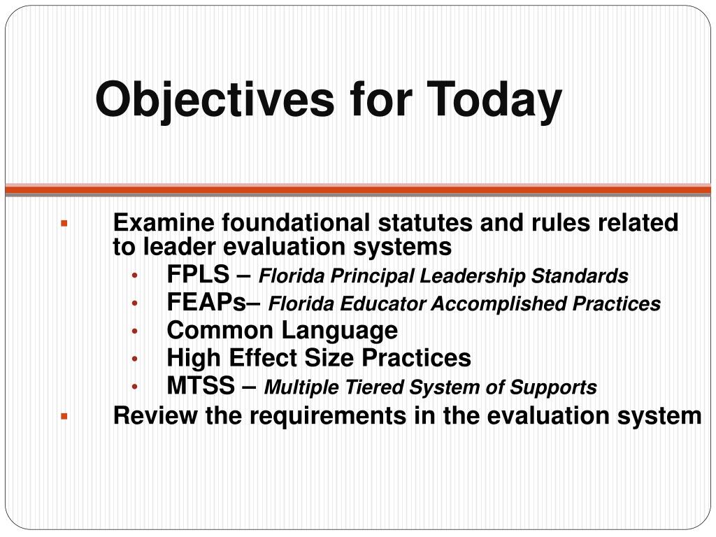 Objectives for Today Examine foundational statutes and rules related to leader evaluation systems FPLS – Florida Principal Leadership Standards FEAPs– Florida Educator Accomplished Practices Common Language High Effect Size Practices MTSS – Multiple Tiered System of Supports Review the requirements in the evaluation system
