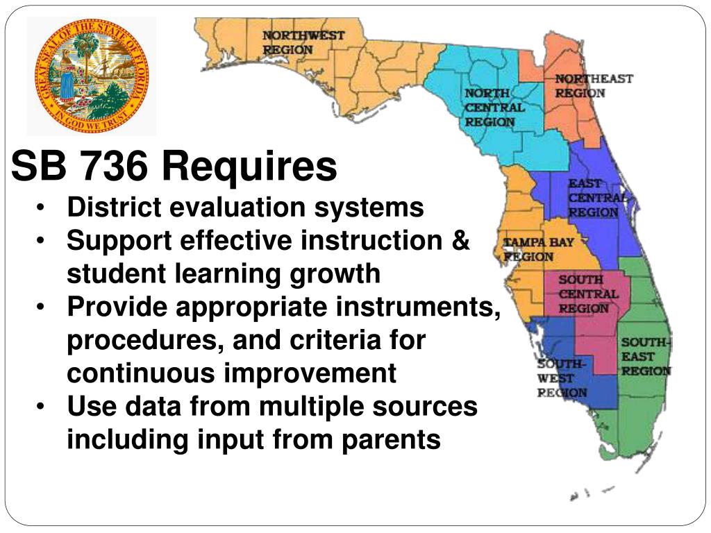SB 736 Requires • District evaluation systems • Support effective instruction & student learning growth • Provide appropriate instruments, procedures, and criteria for continuous improvement • Use data from multiple sources including input from parents
