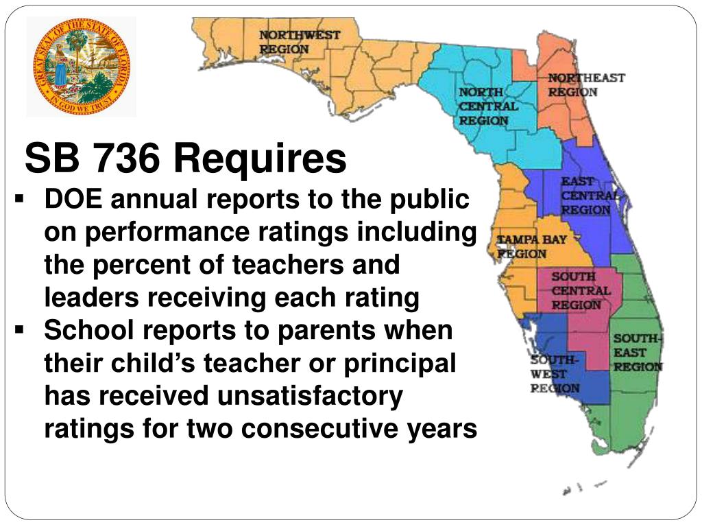 SB 736 Requires • DOE annual reports to the public on performance ratings including the percent of teachers and leaders receiving each rating • School reports to parents when their child’s teacher or principal has received unsatisfactory ratings for two consecutive years