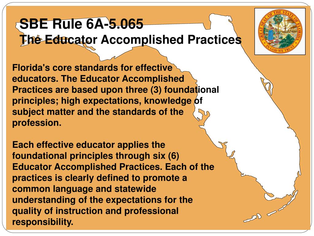 SBE Rule 6A-5.065 The Educator Accomplished Practices Florida's core standards for effective educators. The Educator Accomplished Practices are based upon three (3) foundational principles; high expectations, knowledge of subject matter and the standards of the profession. Each effective educator applies the foundational principles through six (6) Educator Accomplished Practices. Each of the practices is clearly defined to promote a common language and statewide understanding of the expectations for the quality of instruction and professional responsibility.