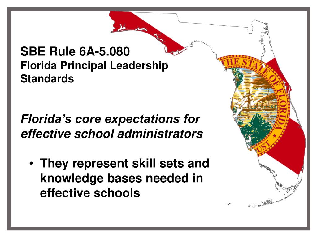 SBE Rule 6A-5.080 • Florida Principal Leadership Standards • Florida’s core expectations for effective school administrators • They represent skill sets and knowledge bases needed in effective schools
