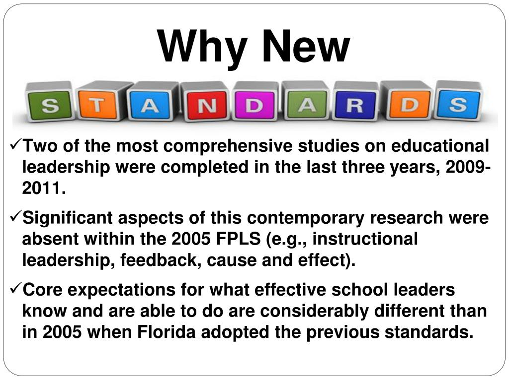 Why New • Two of the most comprehensive studies on educational leadership were completed in the last three years, 2009-2011. • Significant aspects of this contemporary research were absent within the 2005 FPLS (e.g., instructional leadership, feedback, cause and effect). • Core expectations for what effective school leaders know and are able to do are considerably different than in 2005 when Florida adopted the previous standards.