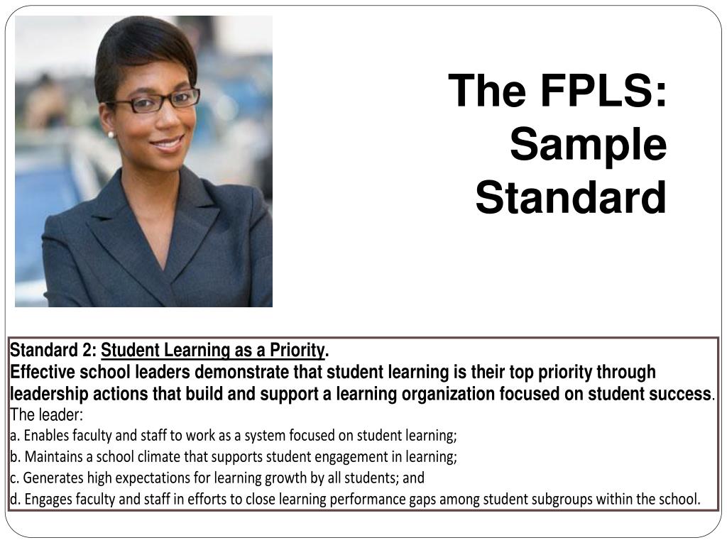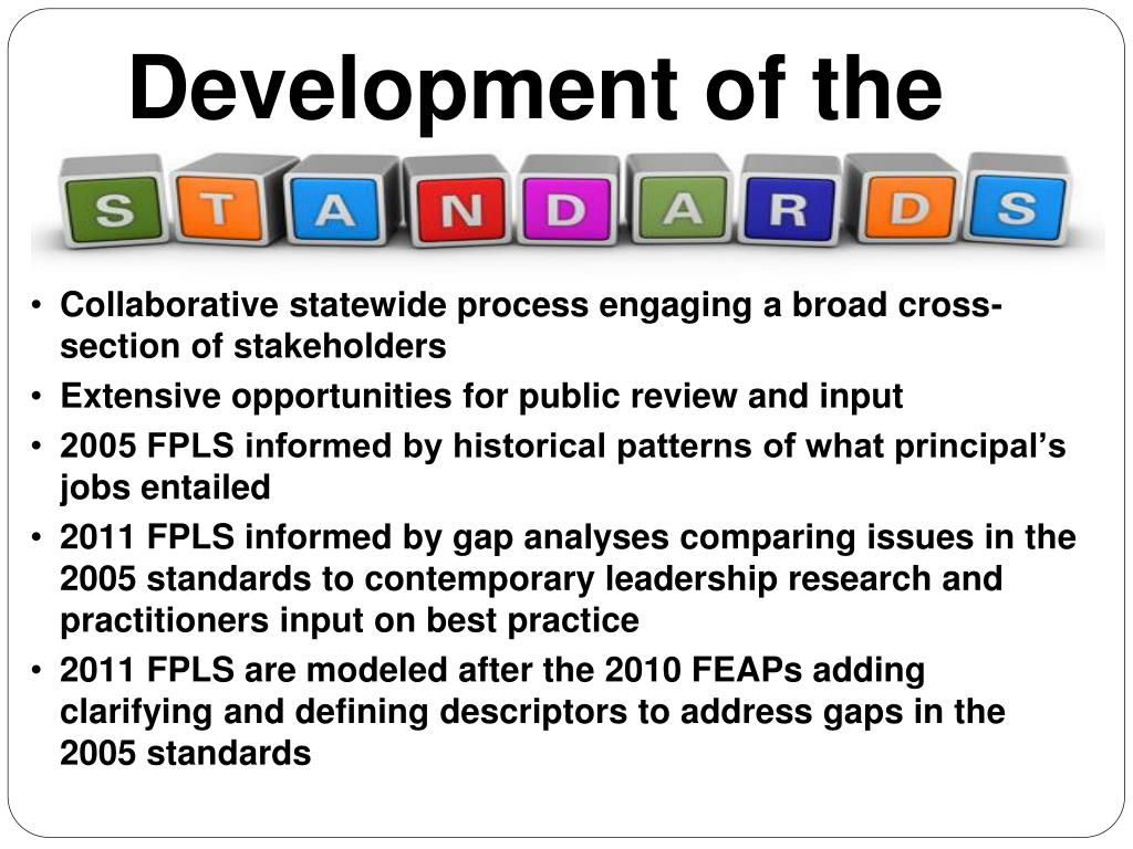 Development of the • Collaborative statewide process engaging a broad cross-section of stakeholders • Extensive opportunities for public review and input • 2005 FPLS informed by historical patterns of what principal’s jobs entailed • 2011 FPLS informed by gap analyses comparing issues in the 2005 standards to contemporary leadership research and practitioners input on best practice • 2011 FPLS are modeled after the 2010 FEAPs adding clarifying and defining descriptors to address gaps in the 2005 standards