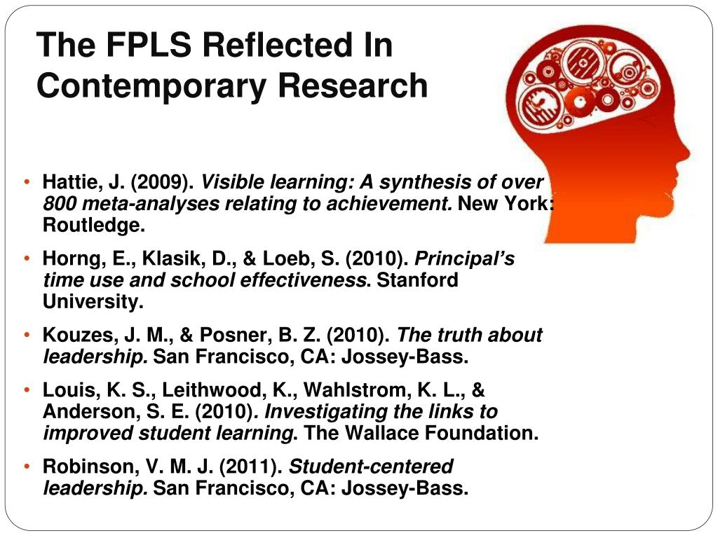 The FPLS Reflected In Contemporary Research • Hattie, J. (2009). Visible learning: A synthesis of over 800 meta-analyses relating to achievement. New York: Routledge. • Horng, E., Klasik, D., & Loeb, S. (2010). Principal’s time use and school effectiveness. Stanford University. • Kouzes, J. M., & Posner, B. Z. (2010). The truth about leadership. San Francisco, CA: Jossey-Bass. • Louis, K. S., Leithwood, K., Wahlstrom, K. L., & Anderson, S. E. (2010). Investigating the links to improved student learning. The Wallace Foundation. • Robinson, V. M. J. (2011). Student-centered leadership. San Francisco, CA: Jossey-Bass.