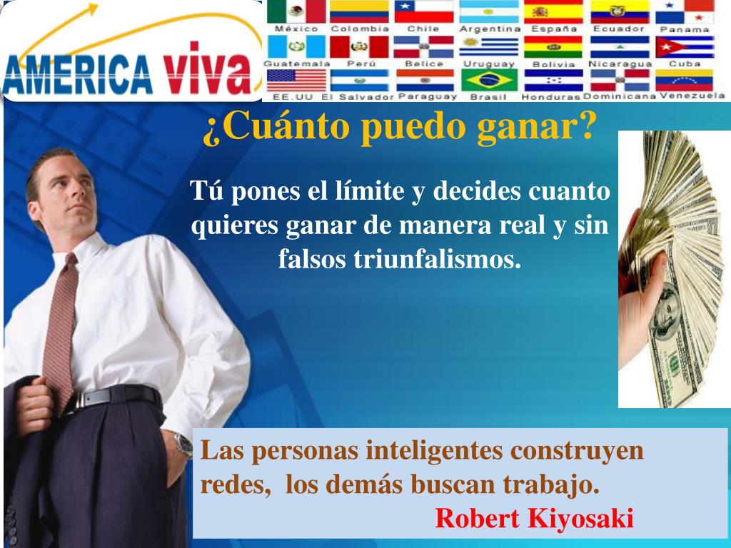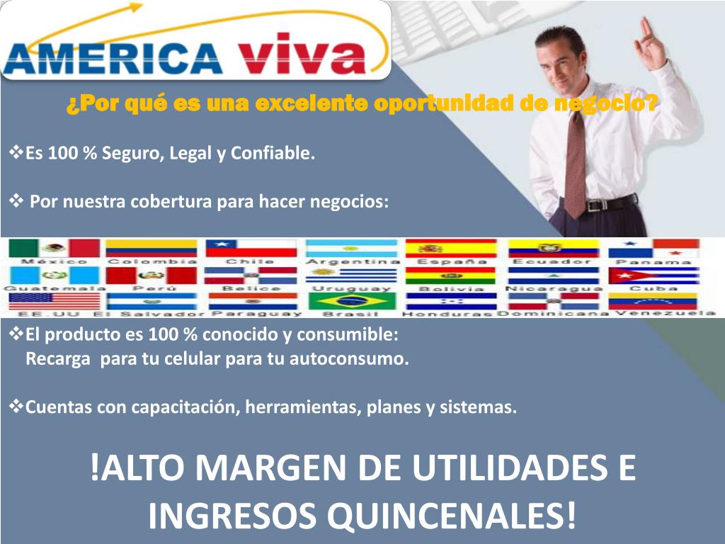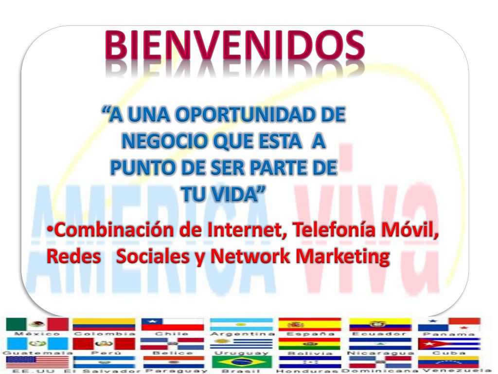 Content Page • ¿Por qué es una excelente oportunidad de negocio? • La ÚNICA inversión es de sólo $ 95.00 Dólares una sola vez. • El producto es 100 % conocido y consumible: Tiempo • Aire Electrónico para tu celular para tu autoconsumo. • Siempre te apoyamos. • En tu negocio núnca estas sólo. • Alto margen de utilidades e ingresos quincenales • ¿Por qué es una excelente oportunidad de negocio? • Es 100 % Seguro, Legal y Confiable. • Estamos en condiciones de hacer negocios en: • Cuentas con capacitación, herramientas, planes y • sistemas. • YA BASTA DE PERSEGUIR A TUS FAMILIARES, • AMIGOS Y CONOCIDOS !!! ¿Cuánto puedo ganar? Tú pones el límite y decides cuanto quieres ganar de manera real y sin falsos triunfalismos. • ¿Que tienes que hacer? • Inscribirte y abrir tu negocio • Capacitarte • Dedicar 2 horas diarias a tu negocio. • Abrir más centros de negocios y que sus dueños (tus socios) hagan lo mismo. • Enseñarlos y ayudarlos. • Your Text here • Lorem ipsum dolor sit amet, consectetuer adipiscing elit, sed diam nonummy nibh euismod tincidunt ut laoreet dolore magna aliquam erat volutpat. Ut wisi enim ad minim veniam, quis nostrud exerci tation ullamcorper suscipit lobortis nisl ut aliquip ex ea commodo consequat. • Duis autem vel eum iriure dolor in hendrerit in vulputate velit esse molestie consequat, vel illum dolore eu feugiat nulla facilisis at vero eros et accumsan et iusto odio dignissim qui blandit praesent luptatum zzril delenit augue duis dolore Es una empresa multinivel legalmente constituida en Los Estados Unidos Mexicanos y de acuerdo al Pacto Mundial de Davos, Suiza y cuya marca esta registrada RAZON SOCIAL: AMERICA VIVA COMERCIALIZADORA INTEGRAL S.A. DE C.V. REGISTRO FISCAL FEDERAL. (RFC): AVC040415CJ4. Las personas inteligentes construyen redes, los demás buscan trabajo. Robert Kiyosaki
