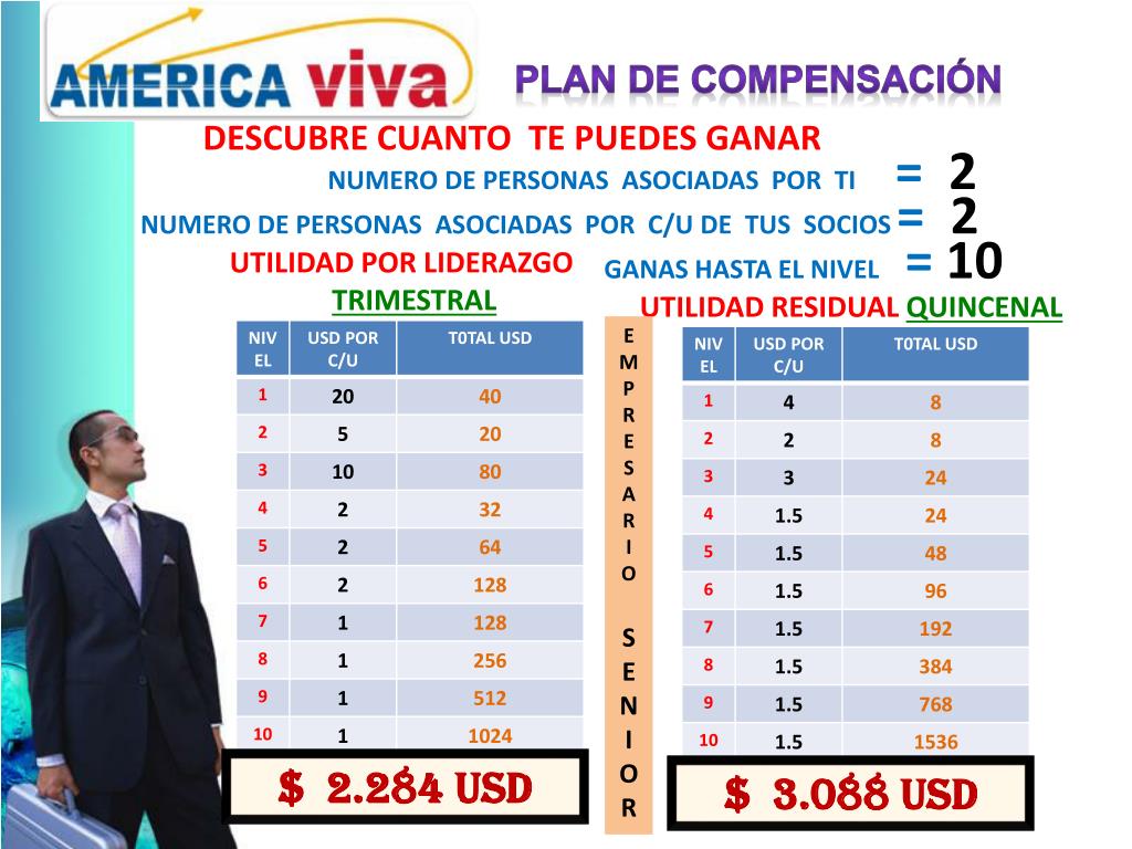 Plan de compensación DESCUBRE CUANTO TE PUEDES GANAR NUMERO DE PERSONAS ASOCIADAS POR TI = 2 NUMERO DE PERSONAS ASOCIADAS POR C/U DE TUS SOCIOS = 2 GANAS HASTA EL NIVEL = 10 UTILIDAD POR LIDERAZGO TRIMESTRAL UTILIDAD RESIDUAL QUINCENAL E M P R E S A R I O S E N I O R $ 2.284 USD $ 3.088 USD
