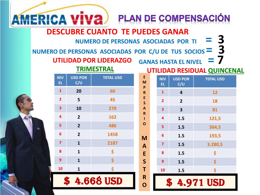Plan de compensación DESCUBRE CUANTO TE PUEDES GANAR NUMERO DE PERSONAS ASOCIADAS POR TI = 3 NUMERO DE PERSONAS ASOCIADAS POR C/U DE TUS SOCIOS = 3 GANAS HASTA EL NIVEL = 7 UTILIDAD POR LIDERAZGO TRIMESTRAL UTILIDAD RESIDUAL QUINCENAL E M P R E S A R I O M A E S T R O $ 4.668 USD $ 4.971 USD