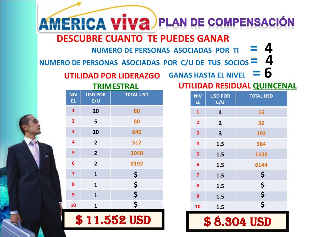 Plan de compensación DESCUBRE CUANTO TE PUEDES GANAR NUMERO DE PERSONAS ASOCIADAS POR TI = 4 NUMERO DE PERSONAS ASOCIADAS POR C/U DE TUS SOCIOS = 4 GANAS HASTA EL NIVEL = 6 UTILIDAD POR LIDERAZGO TRIMESTRAL UTILIDAD RESIDUAL QUINCENAL $ $ $ $ $ $ $ $ $ 11.552 USD $ 8.304 USD