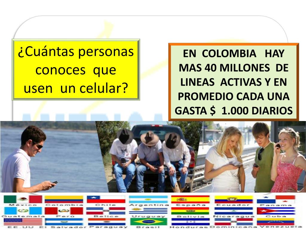 ¿Cuántas personas conoces que usen un celular? EN COLOMBIA HAY MAS 40 MILLONES DE LINEAS ACTIVAS Y EN PROMEDIO CADA UNA GASTA $ 1.000 DIARIOS