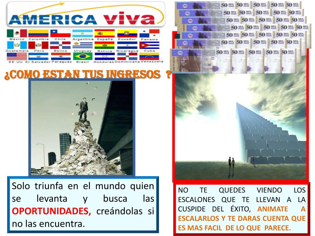 ¿COMO ESTAN TUS INGRESOS ? Solo triunfa en el mundo quien se levanta y busca las OPORTUNIDADES, creándolas si no las encuentra. NO TE QUEDES VIENDO LOS ESCALONES QUE TE LLEVAN A LA CUSPIDE DEL ÉXITO, ANIMATE A ESCALARLOS Y TE DARAS CUENTA QUE ES MAS FACIL DE LO QUE PARECE.